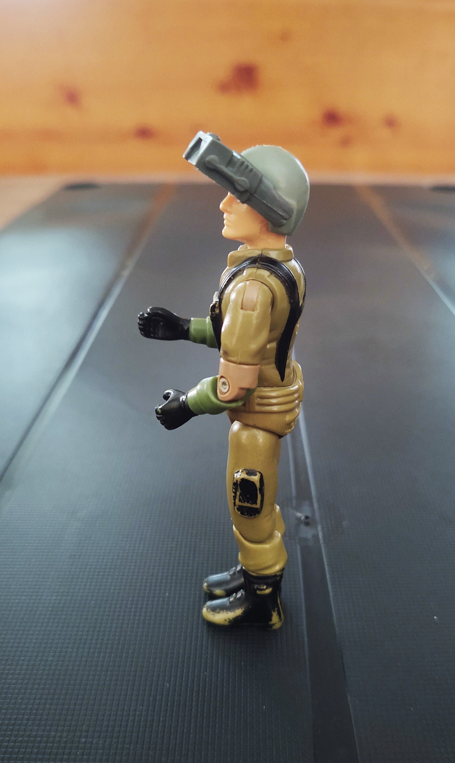 Hasbro GI Joe ARAH 1983 Steeler Action Figure with helmet and accessory pack visor. Steeler's joints and O ring are all really tight. His black paint has a little wear here and there, most noticeably on his boots, but his face, holster and gloves are all fairly nice.