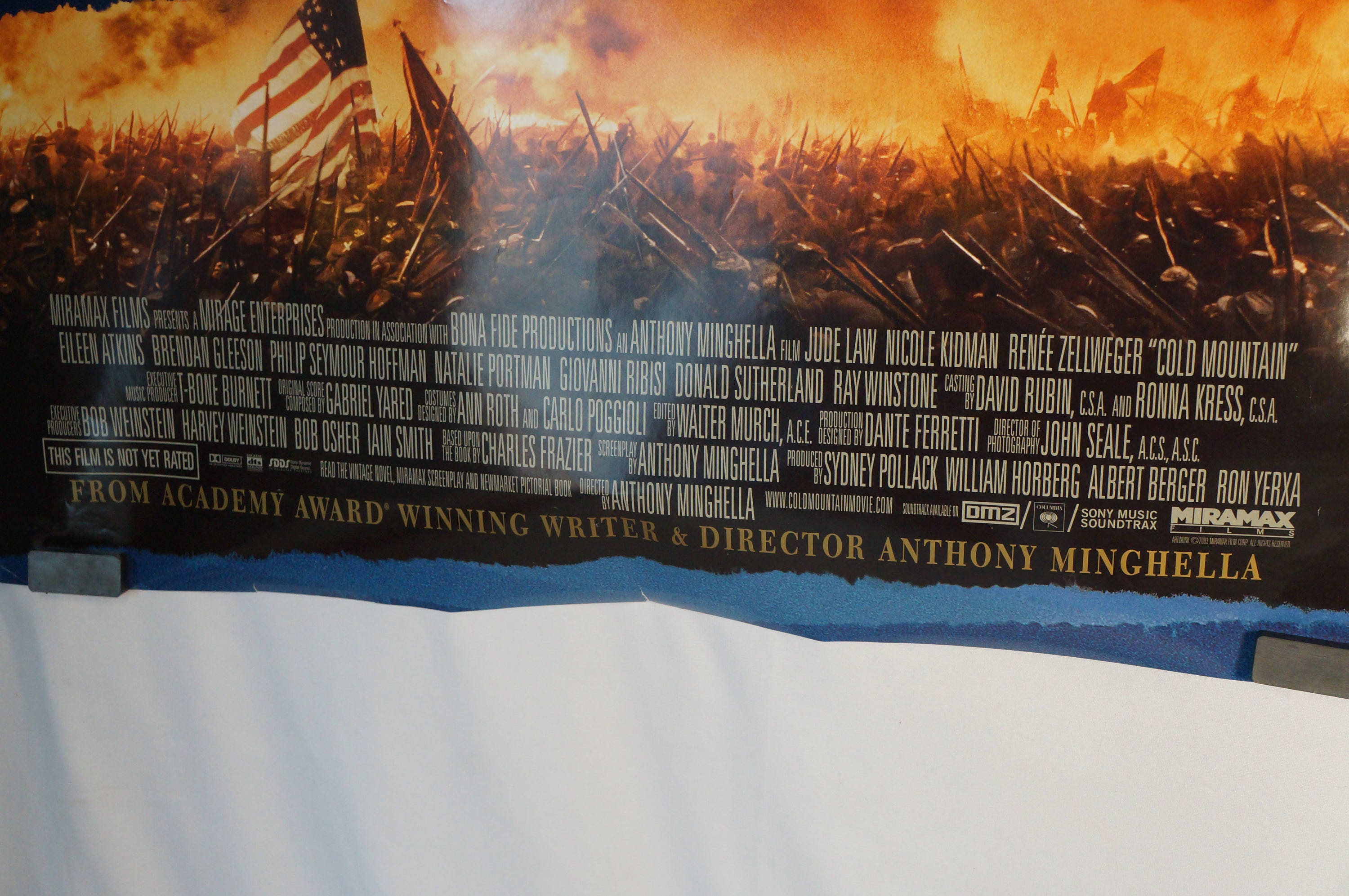 "I'll never leave Cold Mountain!" Oscar-winning Civil War drama with a truly legendary cast: Jude Law, Nicole Kidman, Renee Zellweger, Philip Seymour Hoffman, Natalie Portman, and Donald Sutherland, among others. This is an authentic double-sided advance (before the film was rated) theater one-sheet. In nice shape, no pin holes or tape, never been folded or crushed. This ships in a sturdy cardboard tube.
